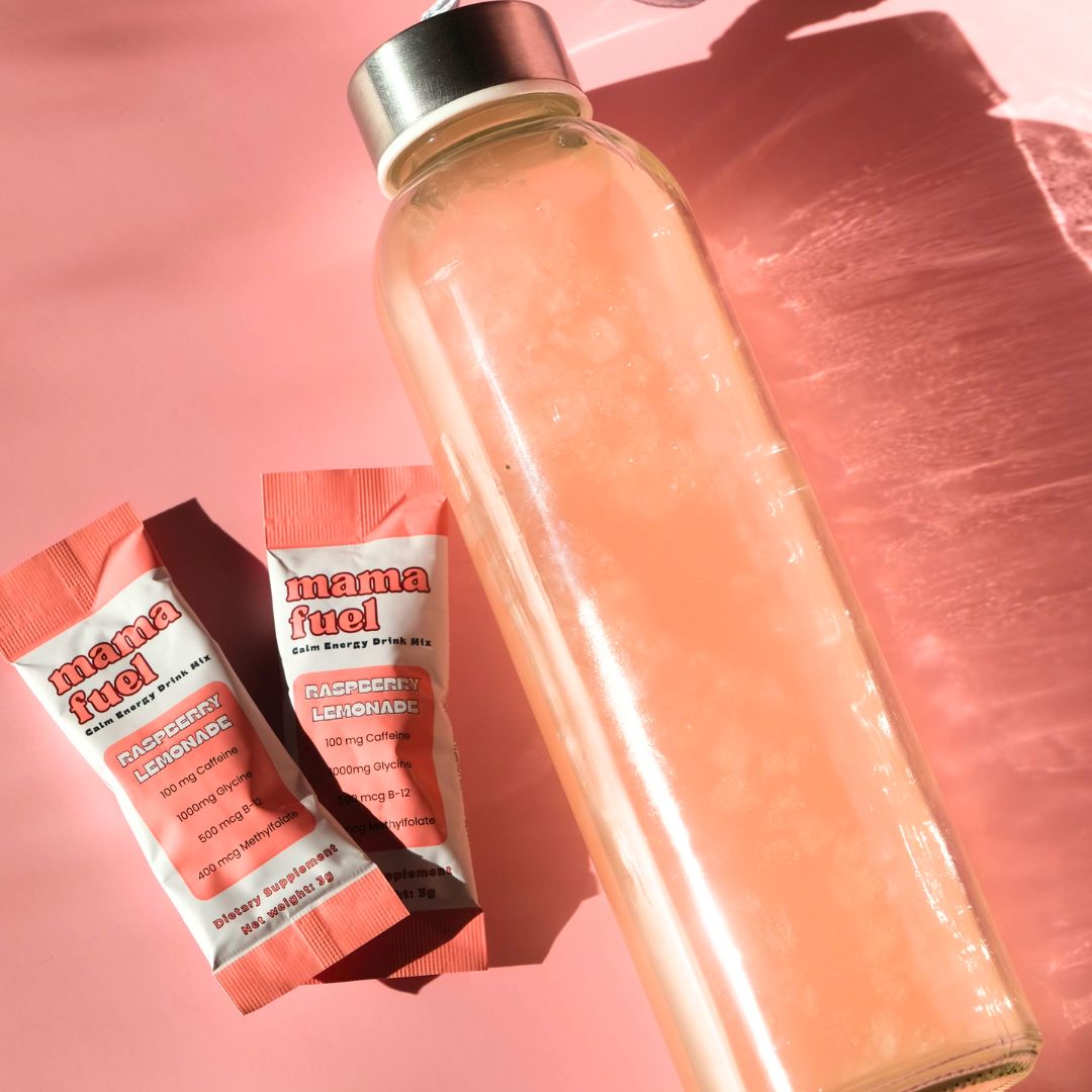 Mama Fuel: 100mg caffeine PLUS Glycine (1,000mg) and Magnesium Glycinate (120mg). These nutrients smooth out the energy curve so you get: